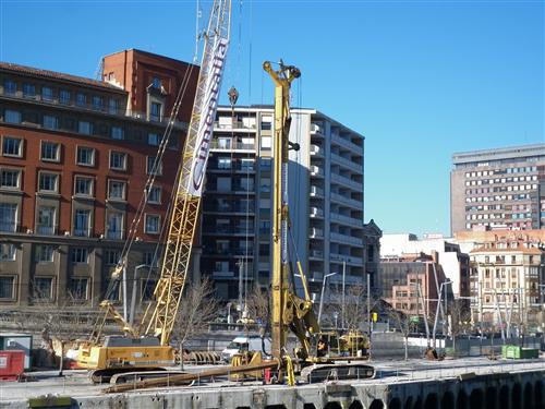 Ejecución por el método de rotación, de contención mediante entubación metálica no recuperable introducido por vibración hasta una profundidad de 12 m para una profundidad total de hasta 15 m. Se utilizaron herramientas especiales de widia para atravesar bloques de escollera y capas de hormigón y empotrar en Margocalizas.